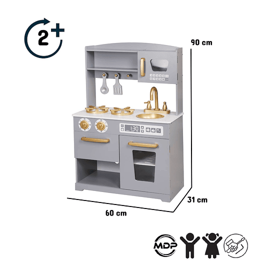 Una cocina infantil proporciona una entretenida forma de introducir a los niños en el mundo de la alimentación y el juego de rol basado en la observación. Ya que les permite crear y explorar de forma lúdica y apropiada a su edad experiencias divertidas en relación a los alimentos, utensilios y electrodomésticos. Donde aprenderán su uso, sus funciones y para qué sirve cada accesorio. Aportando en el desarrollo de habilidades motrices finas, habilidades cognitivas y sociales. La cocina de juguete gris es una completa cocina que estimulara la imaginación en los pequeños chefs, incentivando al mismo tiempo a recrear actividades cotidianas que observan en la cocina de su hogar. Ideal para desarrollar la creatividad y habilidades con experiencias lúdicas mientras cocinan y utilizan los diferentes espacios, muebles y accesorios incluidos.