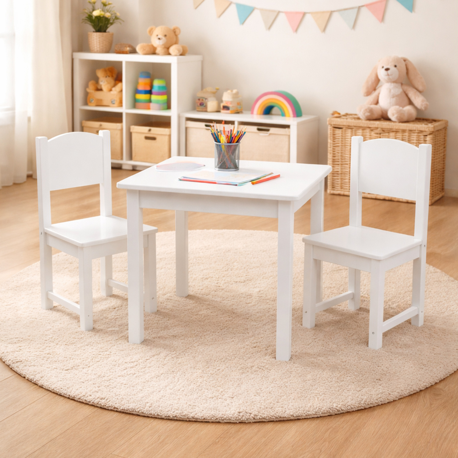 La importancia de una mesa infantil consiste en brindar a los niños un espacio cómodo y atractivo para realizar sus deberes en forma adecuada. A pesar de parecer un mueble simple y sencillo, la mesa infantil es muy importante en el desarrollo de las habilidades infantiles porque los niños en ella aprenderán a trabajar en un espacio asignado, permitiéndoles comodidad, seguridad y concentración en forma lúdica y natural. Les dará confianza para seguir reglas e interactuar con otros niños desarrollando distintas habilidades que aportaran a su desarrollo motriz, social y cognitivo. El set de mesa con 2 sillas W08G145 está diseñado en madera, por lo que será muy práctico y resistente, ideal para incentivar a los pequeños a distraerse desarrollando su motricidad e imaginación. Se recomienda a partir de los 18 meses en adelante.