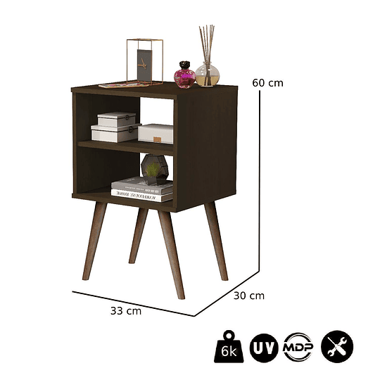 Un velador es una mesa auxiliar que sirve para apoyar lámparas, libros u otros objetos que necesitemos tener a mano cuando descansamos. Su tamaño y utilidad los hace muy comunes en el dormitorio. También pueden ser usados como apoyo en otras zonas de la casa o en cualquier rincón u otros espacios poco útiles como los situados entre dos sillones, junto a una estantería, etc. El velador Be Design es un complemento ideal para apoyar a la decoración en cualquier habitación. Tiene un diseño simple, acogedor y moderno que lo convierte en un mueble muy fácil de combinar y de adaptar a cualquier estilo de decoración. Elaborado en MDP, incluye dos cajones y cuatro patas estilo Retro. Un bello complemento, muy fácil de ubicar en cualquier lugar de nuestro hogar.